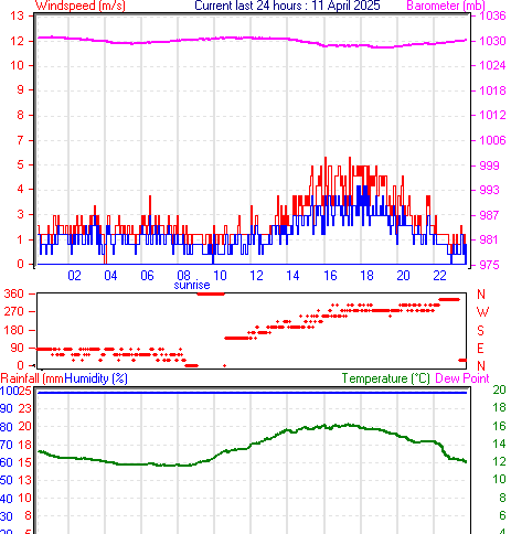 --------------------------------------------------- Average temperature 13.6 °C Average humidity 100 % Average dewpoint 13.6 °C Average barometer 1030.6 mb Average windspeed 1.6 m/s Average gustspeed 2.3 m/s Average direction 288 ° (WNW) Rainfall for month 1.0 mm Rainfall for year 204.6 mm ----------------------------------------------------------- Maximum rain per minute 0.2 mm on day 10 at time 08:21 Maximum temperature 16.3 °C on day 10 at time 17:21 Minimum temperature 11.6 °C on day 10 at time 08:47 Minimum pressure 1028.4 mb on day 10 at time 19:47 Maximum pressure 1031.0 mb on day 10 at time 01:17 Maximum windspeed 4.6 m/s from 250° on day 10 at time 16:08 Maximum gust speed 6.7 m/s from 279° on day 10 at time 17:21 Maximum humidity 100 % on day 10 at time 00:02 Minimum humidity 100 % on day 10 at time 00:02 Maximum heat index 16.3 °C on day 10 at time 17:21 Rain for the day :0.6 mm Click here for todays 24 hour graph :10 :4 :2025 ------------------------------------------------------------ Averages\Extremes for day :11![]()