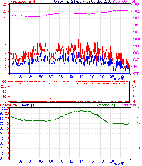 --------------------------------------------------- Average temperature 16.1 °C Average humidity 100 % Average dewpoint 16.1 °C Average barometer 1026.5 mb Average windspeed 4.3 m/s Average gustspeed 6.9 m/s Average direction 2 ° ( N ) Rainfall for month 0.2 mm Rainfall for year 351.4 mm ----------------------------------------------------------- Maximum rain per minute 0.0 mm on day 02 at time 00:02 Maximum temperature 19.3 °C on day 02 at time 14:26 Minimum temperature 13.5 °C on day 02 at time 23:19 Minimum pressure 1023.5 mb on day 02 at time 05:44 Maximum pressure 1028.6 mb on day 02 at time 22:41 Maximum windspeed 8.7 m/s from 010° on day 02 at time 12:40 Maximum gust speed 13.9 m/s from 342° on day 02 at time 16:09 Maximum humidity 100 % on day 02 at time 00:02 Minimum humidity 100 % on day 02 at time 00:02 Maximum heat index 18.0 °C on day 02 at time 16:46 Click here for todays 24 hour graph :2 :10 :2025 ------------------------------------------------------------ Averages\Extremes for day :03![]()