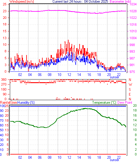 --------------------------------------------------- Average temperature 14.7 °C Average humidity 100 % Average dewpoint 14.7 °C Average barometer 1028.2 mb Average windspeed 2.8 m/s Average gustspeed 4.3 m/s Average direction 339 ° (NNW) Rainfall for month 0.2 mm Rainfall for year 351.4 mm ----------------------------------------------------------- Maximum rain per minute 0.0 mm on day 03 at time 00:02 Maximum temperature 19.0 °C on day 03 at time 15:40 Minimum temperature 10.9 °C on day 03 at time 23:59 Minimum pressure 1025.7 mb on day 03 at time 17:44 Maximum pressure 1028.5 mb on day 03 at time 10:17 Maximum windspeed 7.7 m/s from 326° on day 03 at time 14:55 Maximum gust speed 13.9 m/s from 359° on day 03 at time 11:28 Maximum humidity 100 % on day 03 at time 00:02 Minimum humidity 100 % on day 03 at time 00:02 Maximum heat index 18.0 °C on day 03 at time 17:50 Click here for todays 24 hour graph :3 :10 :2025 ------------------------------------------------------------ Averages\Extremes for day :04![]()