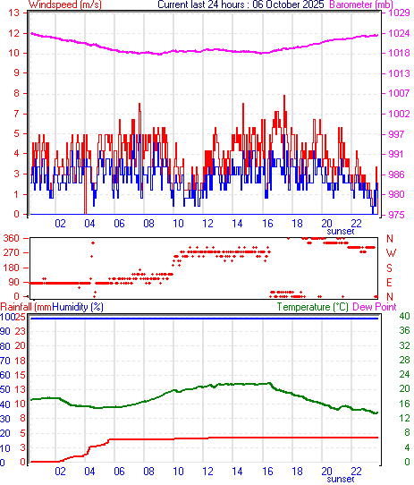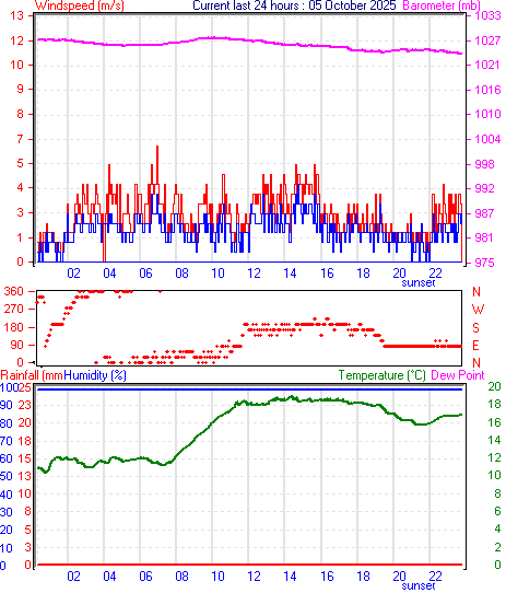 --------------------------------------------------- Average temperature 17.7 °C Average humidity 100 % Average dewpoint 17.7 °C Average barometer 1020.9 mb Average windspeed 2.4 m/s Average gustspeed 3.7 m/s Average direction 32 ° (NNE) Rainfall for month 4.4 mm Rainfall for year 355.6 mm ----------------------------------------------------------- Maximum rain per minute 0.2 mm on day 05 at time 12:20 Maximum temperature 21.8 °C on day 05 at time 16:31 Minimum temperature 13.2 °C on day 05 at time 23:42 Minimum pressure 1017.8 mb on day 05 at time 09:07 Maximum pressure 1023.9 mb on day 04 at time 00:04 Maximum windspeed 5.1 m/s from 06° on day 05 at time 17:31 Maximum gust speed 8.2 m/s from 011° on day 05 at time 17:13 Maximum humidity 100 % on day 05 at time 00:02 Minimum humidity 100 % on day 05 at time 00:02 Maximum heat index 18.0 °C on day 05 at time 18:41 Rain for the day :4.2 mm Click here for todays 24 hour graph :5 :10 :2025 ------------------------------------------------------------ Averages\Extremes for day :06![]()