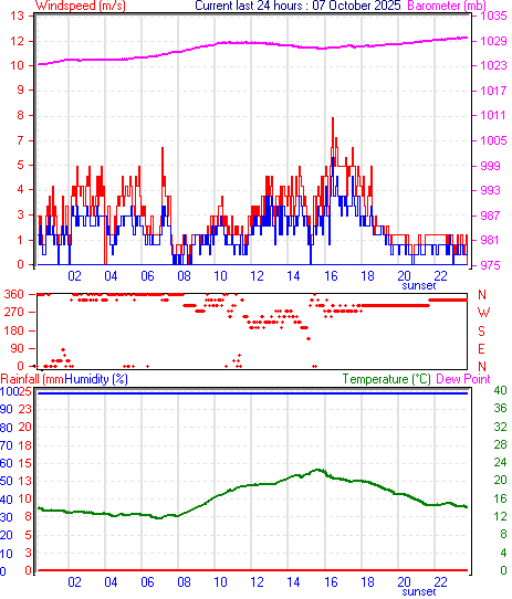 --------------------------------------------------- Average temperature 16.4 °C Average humidity 100 % Average dewpoint 16.4 °C Average barometer 1030.1 mb Average windspeed 1.5 m/s Average gustspeed 2.3 m/s Average direction 278 ° ( W ) Rainfall for month 4.4 mm Rainfall for year 355.6 mm ----------------------------------------------------------- Maximum rain per minute 0.0 mm on day 07 at time 00:02 Maximum temperature 20.5 °C on day 07 at time 16:52 Minimum temperature 9.6 °C on day 07 at time 07:51 Minimum pressure 1028.1 mb on day 07 at time 18:05 Maximum pressure 1031.0 mb on day 07 at time 10:04 Maximum windspeed 6.2 m/s from 277° on day 07 at time 16:34 Maximum gust speed 8.7 m/s from 267° on day 07 at time 14:50 Maximum humidity 100 % on day 07 at time 00:02 Minimum humidity 100 % on day 07 at time 00:02 Maximum heat index 18.0 °C on day 07 at time 20:46 Click here for todays 24 hour graph :7 :10 :2025 ------------------------------------------------------------ Averages\Extremes for day :08![]()