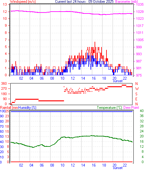 --------------------------------------------------- Average temperature 16.9 °C Average humidity 100 % Average dewpoint 16.9 °C Average barometer 1028.9 mb Average windspeed 1.1 m/s Average gustspeed 1.8 m/s Average direction 264 ° ( W ) Rainfall for month 4.4 mm Rainfall for year 355.6 mm ----------------------------------------------------------- Maximum rain per minute 0.0 mm on day 08 at time 00:02 Maximum temperature 20.8 °C on day 08 at time 15:56 Minimum temperature 11.4 °C on day 08 at time 04:49 Minimum pressure 1026.3 mb on day 08 at time 17:49 Maximum pressure 1029.9 mb on day 08 at time 01:36 Maximum windspeed 4.1 m/s from 273° on day 08 at time 16:37 Maximum gust speed 6.2 m/s from 270° on day 08 at time 16:44 Maximum humidity 100 % on day 08 at time 00:02 Minimum humidity 100 % on day 08 at time 00:02 Maximum heat index 18.0 °C on day 08 at time 21:29 Click here for todays 24 hour graph :8 :10 :2025 ------------------------------------------------------------ Averages\Extremes for day :09![]()