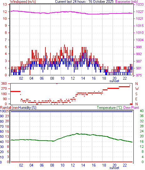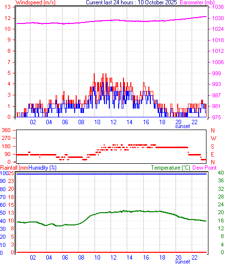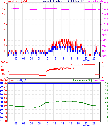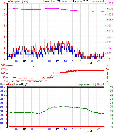 --------------------------------------------------- Average temperature 17.6 °C Average humidity 100 % Average dewpoint 17.6 °C Average barometer 1030.2 mb Average windspeed 1.1 m/s Average gustspeed 1.8 m/s Average direction 237 ° (WSW) Rainfall for month 4.8 mm Rainfall for year 356.0 mm ----------------------------------------------------------- Maximum rain per minute 0.2 mm on day 13 at time 05:46 Maximum temperature 21.0 °C on day 13 at time 15:47 Minimum temperature 14.4 °C on day 13 at time 07:22 Minimum pressure 1028.2 mb on day 13 at time 18:22 Maximum pressure 1031.0 mb on day 12 at time 00:12 Maximum windspeed 4.1 m/s from 217° on day 13 at time 13:58 Maximum gust speed 5.1 m/s from 221° on day 13 at time 14:19 Maximum humidity 100 % on day 13 at time 00:02 Minimum humidity 100 % on day 13 at time 00:02 Maximum heat index 18.0 °C on day 13 at time 20:27 Rain for the day :0.2 mm Click here for todays 24 hour graph :13 :10 :2025 ------------------------------------------------------------ Averages\Extremes for day :14![]()