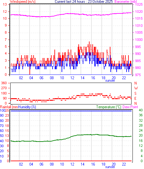 --------------------------------------------------- Average temperature 18.1 °C Average humidity 100 % Average dewpoint 18.1 °C Average barometer 1018.5 mb Average windspeed 2.0 m/s Average gustspeed 2.8 m/s Average direction 94 ° ( E ) Rainfall for month 8.0 mm Rainfall for year 359.2 mm ----------------------------------------------------------- Maximum rain per minute 0.0 mm on day 22 at time 00:02 Maximum temperature 21.1 °C on day 22 at time 16:58 Minimum temperature 15.2 °C on day 22 at time 06:24 Minimum pressure 1016.3 mb on day 22 at time 07:50 Maximum pressure 1019.3 mb on day 22 at time 00:02 Maximum windspeed 5.1 m/s from 134° on day 22 at time 15:39 Maximum gust speed 7.2 m/s from 125° on day 22 at time 15:18 Maximum humidity 100 % on day 22 at time 00:02 Minimum humidity 100 % on day 22 at time 00:02 Maximum heat index 18.0 °C on day 22 at time 11:19 Click here for todays 24 hour graph :22 :10 :2025 ------------------------------------------------------------ Averages\Extremes for day :23![]()