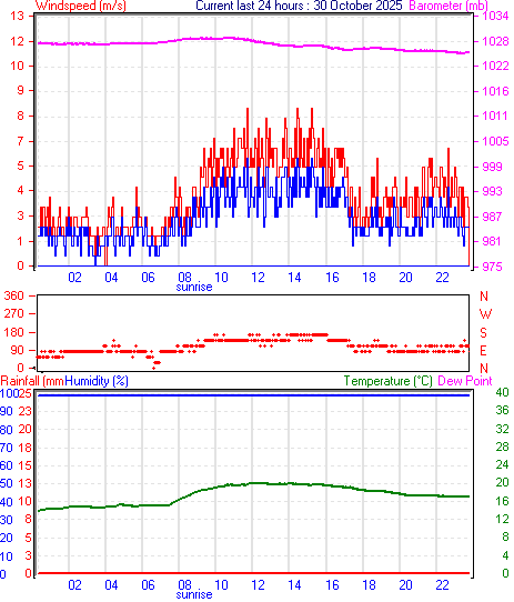 --------------------------------------------------- Average temperature 17.3 °C Average humidity 100 % Average dewpoint 17.3 °C Average barometer 1028.2 mb Average windspeed 2.5 m/s Average gustspeed 3.8 m/s Average direction 116 ° (ESE) Rainfall for month 8.0 mm Rainfall for year 359.2 mm ----------------------------------------------------------- Maximum rain per minute 0.0 mm on day 29 at time 00:02 Maximum temperature 20.1 °C on day 29 at time 12:22 Minimum temperature 13.7 °C on day 28 at time 00:10 Minimum pressure 1025.5 mb on day 29 at time 23:31 Maximum pressure 1029.2 mb on day 29 at time 11:19 Maximum windspeed 6.2 m/s from 143° on day 29 at time 15:19 Maximum gust speed 8.7 m/s from 128° on day 29 at time 13:46 Maximum humidity 100 % on day 29 at time 00:02 Minimum humidity 100 % on day 29 at time 00:02 Maximum heat index 18.0 °C on day 29 at time 19:33 Click here for todays 24 hour graph :29 :10 :2025 ------------------------------------------------------------ Averages\Extremes for day :30![]()