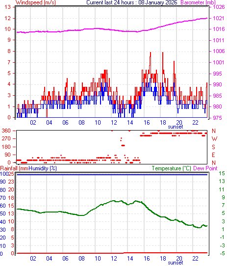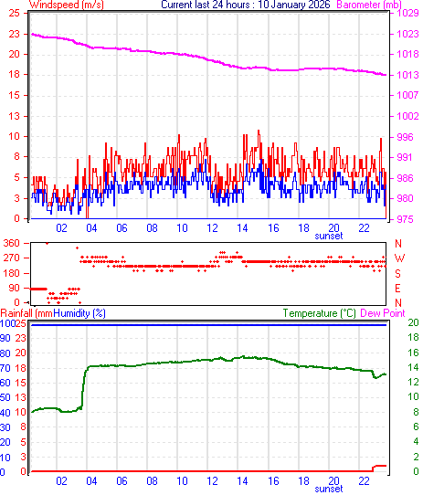 --------------------------------------------------- Average temperature 9.3 °C Average humidity 100 % Average dewpoint 9.3 °C Average barometer 1011.7 mb Average windspeed 2.6 m/s Average gustspeed 3.9 m/s Average direction 283 ° (WNW) Rainfall for month 54.8 mm Rainfall for year 54.8 mm ----------------------------------------------------------- Maximum rain per minute 0.8 mm on day 10 at time 05:53 Maximum temperature 13.4 °C on day 09 at time 00:31 Minimum temperature 4.9 °C on day 10 at time 23:48 Minimum pressure 1006.7 mb on day 10 at time 07:34 Maximum pressure 1016.9 mb on day 10 at time 00:02 Maximum windspeed 8.2 m/s from 244° on day 10 at time 02:50 Maximum gust speed 12.9 m/s from 226° on day 10 at time 01:06 Maximum humidity 100 % on day 10 at time 00:02 Minimum humidity 100 % on day 10 at time 00:02 Maximum heat index 13.4 °C on day 09 at time 00:31 Rain for the day :9.0 mm Click here for todays 24 hour graph :10 :1 :2026 ------------------------------------------------------------ Averages\Extremes for day :11![]()