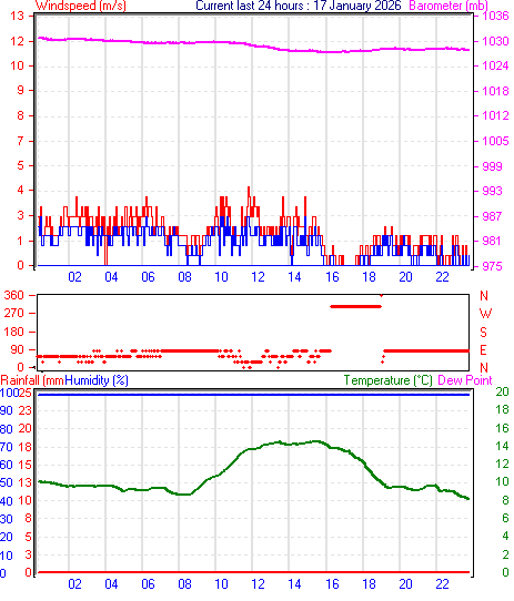 --------------------------------------------------- Average temperature 12.7 °C Average humidity 100 % Average dewpoint 12.7 °C Average barometer 1028.7 mb Average windspeed 2.3 m/s Average gustspeed 3.4 m/s Average direction 40 ° ( NE) Rainfall for month 54.8 mm Rainfall for year 54.8 mm ----------------------------------------------------------- Maximum rain per minute 0.0 mm on day 18 at time 00:02 Maximum temperature 15.4 °C on day 18 at time 14:25 Minimum temperature 11.0 °C on day 18 at time 08:31 Minimum pressure 1027.1 mb on day 18 at time 16:14 Maximum pressure 1029.6 mb on day 18 at time 11:15 Maximum windspeed 4.6 m/s from 037° on day 18 at time 23:02 Maximum gust speed 7.2 m/s from 033° on day 18 at time 23:06 Maximum humidity 100 % on day 18 at time 00:02 Minimum humidity 100 % on day 18 at time 00:02 Maximum heat index 15.4 °C on day 18 at time 14:25 Click here for todays 24 hour graph :18 :1 :2026 ------------------------------------------------------------ Averages\Extremes for day :19![]()