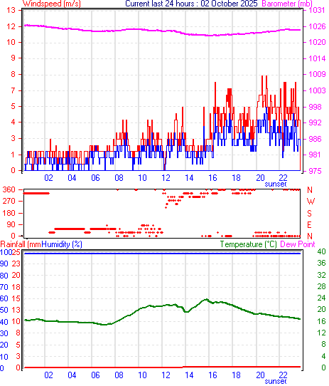 --------------------------------------------------- Average temperature 16.1 °C Average humidity 100 % Average dewpoint 16.1 °C Average barometer 1026.5 mb Average windspeed 4.3 m/s Average gustspeed 6.9 m/s Average direction 2 ° ( N ) Rainfall for month 0.2 mm Rainfall for year 351.4 mm ----------------------------------------------------------- Maximum rain per minute 0.0 mm on day 02 at time 00:02 Maximum temperature 19.3 °C on day 02 at time 14:26 Minimum temperature 13.5 °C on day 02 at time 23:19 Minimum pressure 1023.5 mb on day 02 at time 05:44 Maximum pressure 1028.6 mb on day 02 at time 22:41 Maximum windspeed 8.7 m/s from 010° on day 02 at time 12:40 Maximum gust speed 13.9 m/s from 342° on day 02 at time 16:09 Maximum humidity 100 % on day 02 at time 00:02 Minimum humidity 100 % on day 02 at time 00:02 Maximum heat index 18.0 °C on day 02 at time 16:46 Click here for todays 24 hour graph :2 :10 :2025 ------------------------------------------------------------ Averages\Extremes for day :03![]()