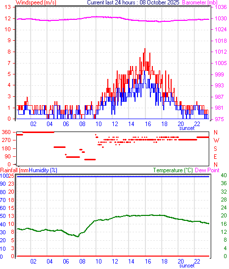--------------------------------------------------- Average temperature 16.4 °C Average humidity 100 % Average dewpoint 16.4 °C Average barometer 1030.1 mb Average windspeed 1.5 m/s Average gustspeed 2.3 m/s Average direction 278 ° ( W ) Rainfall for month 4.4 mm Rainfall for year 355.6 mm ----------------------------------------------------------- Maximum rain per minute 0.0 mm on day 07 at time 00:02 Maximum temperature 20.5 °C on day 07 at time 16:52 Minimum temperature 9.6 °C on day 07 at time 07:51 Minimum pressure 1028.1 mb on day 07 at time 18:05 Maximum pressure 1031.0 mb on day 07 at time 10:04 Maximum windspeed 6.2 m/s from 277° on day 07 at time 16:34 Maximum gust speed 8.7 m/s from 267° on day 07 at time 14:50 Maximum humidity 100 % on day 07 at time 00:02 Minimum humidity 100 % on day 07 at time 00:02 Maximum heat index 18.0 °C on day 07 at time 20:46 Click here for todays 24 hour graph :7 :10 :2025 ------------------------------------------------------------ Averages\Extremes for day :08![]()