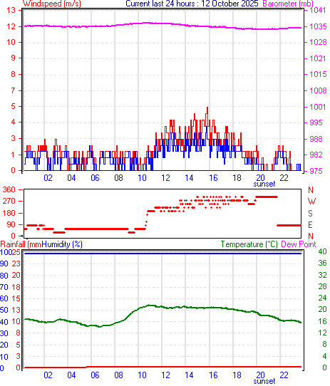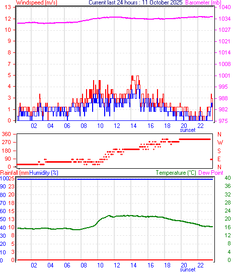 --------------------------------------------------- Average temperature 18.1 °C Average humidity 100 % Average dewpoint 18.1 °C Average barometer 1035.4 mb Average windspeed 1.1 m/s Average gustspeed 1.6 m/s Average direction 282 ° (WNW) Rainfall for month 4.6 mm Rainfall for year 355.8 mm ----------------------------------------------------------- Maximum rain per minute 0.2 mm on day 11 at time 05:35 Maximum temperature 21.7 °C on day 11 at time 10:53 Minimum temperature 14.1 °C on day 11 at time 06:49 Minimum pressure 1033.5 mb on day 11 at time 21:47 Maximum pressure 1036.1 mb on day 11 at time 11:04 Maximum windspeed 3.6 m/s from 235° on day 11 at time 15:49 Maximum gust speed 5.1 m/s from 276° on day 11 at time 15:52 Maximum humidity 100 % on day 11 at time 00:02 Minimum humidity 100 % on day 11 at time 00:02 Maximum heat index 18.0 °C on day 11 at time 21:03 Rain for the day :0.2 mm Click here for todays 24 hour graph :11 :10 :2025 ------------------------------------------------------------ Averages\Extremes for day :12![]()