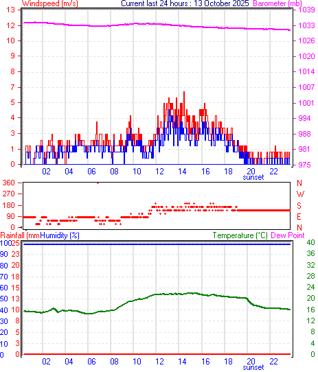 --------------------------------------------------- Average temperature 17.6 °C Average humidity 100 % Average dewpoint 17.6 °C Average barometer 1030.2 mb Average windspeed 1.1 m/s Average gustspeed 1.8 m/s Average direction 237 ° (WSW) Rainfall for month 4.8 mm Rainfall for year 356.0 mm ----------------------------------------------------------- Maximum rain per minute 0.2 mm on day 13 at time 05:46 Maximum temperature 21.0 °C on day 13 at time 15:47 Minimum temperature 14.4 °C on day 13 at time 07:22 Minimum pressure 1028.2 mb on day 13 at time 18:22 Maximum pressure 1031.0 mb on day 12 at time 00:12 Maximum windspeed 4.1 m/s from 217° on day 13 at time 13:58 Maximum gust speed 5.1 m/s from 221° on day 13 at time 14:19 Maximum humidity 100 % on day 13 at time 00:02 Minimum humidity 100 % on day 13 at time 00:02 Maximum heat index 18.0 °C on day 13 at time 20:27 Rain for the day :0.2 mm Click here for todays 24 hour graph :13 :10 :2025 ------------------------------------------------------------ Averages\Extremes for day :14![]()