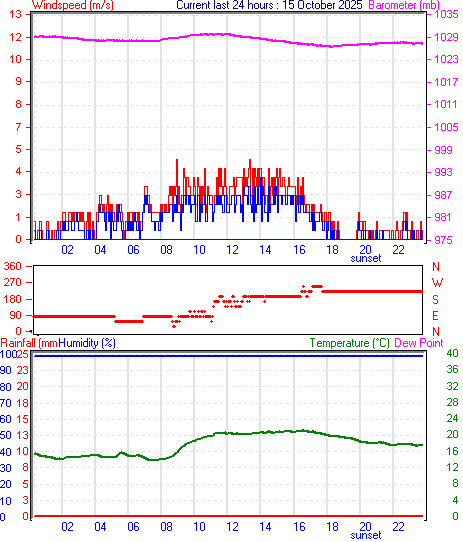 --------------------------------------------------- Average temperature 17.7 °C Average humidity 100 % Average dewpoint 17.7 °C Average barometer 1029.1 mb Average windspeed 1.1 m/s Average gustspeed 1.6 m/s Average direction 146 ° ( SE) Rainfall for month 4.8 mm Rainfall for year 356.0 mm ----------------------------------------------------------- Maximum rain per minute 0.0 mm on day 14 at time 00:02 Maximum temperature 21.3 °C on day 14 at time 16:36 Minimum temperature 13.7 °C on day 14 at time 07:37 Minimum pressure 1026.6 mb on day 14 at time 18:18 Maximum pressure 1030.1 mb on day 14 at time 10:42 Maximum windspeed 3.6 m/s from 186° on day 14 at time 14:03 Maximum gust speed 4.6 m/s from 199° on day 14 at time 15:10 Maximum humidity 100 % on day 14 at time 00:02 Minimum humidity 100 % on day 14 at time 00:02 Maximum heat index 18.0 °C on day 14 at time 21:36 Click here for todays 24 hour graph :14 :10 :2025 ------------------------------------------------------------ Averages\Extremes for day :15![]()