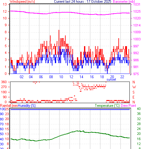 --------------------------------------------------- Average temperature 18.1 °C Average humidity 100 % Average dewpoint 18.1 °C Average barometer 1024.7 mb Average windspeed 2.2 m/s Average gustspeed 3.5 m/s Average direction 2 ° ( N ) Rainfall for month 4.8 mm Rainfall for year 356.0 mm ----------------------------------------------------------- Maximum rain per minute 0.0 mm on day 16 at time 00:02 Maximum temperature 22.6 °C on day 16 at time 13:31 Minimum temperature 14.3 °C on day 16 at time 05:29 Minimum pressure 1022.6 mb on day 16 at time 18:40 Maximum pressure 1025.9 mb on day 15 at time 00:33 Maximum windspeed 5.7 m/s from 016° on day 16 at time 10:10 Maximum gust speed 8.7 m/s from 025° on day 16 at time 10:57 Maximum humidity 100 % on day 16 at time 00:02 Minimum humidity 100 % on day 16 at time 00:02 Maximum heat index 19.3 °C on day 16 at time 13:31 Click here for todays 24 hour graph :16 :10 :2025 ------------------------------------------------------------ Averages\Extremes for day :17![]()
