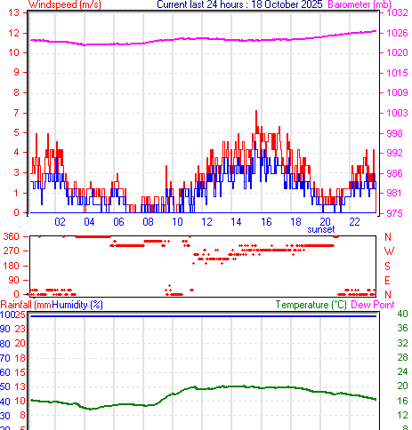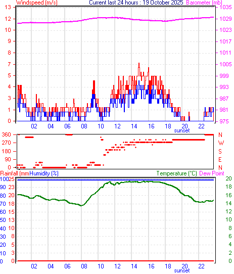 --------------------------------------------------- Average temperature 16.7 °C Average humidity 100 % Average dewpoint 16.7 °C Average barometer 1029.0 mb Average windspeed 1.3 m/s Average gustspeed 2.1 m/s Average direction 294 ° (WNW) Rainfall for month 4.8 mm Rainfall for year 356.0 mm ----------------------------------------------------------- Maximum rain per minute 0.0 mm on day 18 at time 00:02 Maximum temperature 19.5 °C on day 18 at time 15:27 Minimum temperature 13.4 °C on day 18 at time 07:58 Minimum pressure 1026.5 mb on day 17 at time 00:38 Maximum pressure 1029.8 mb on day 18 at time 00:02 Maximum windspeed 5.1 m/s from 270° on day 18 at time 16:00 Maximum gust speed 6.7 m/s from 270° on day 18 at time 16:00 Maximum humidity 100 % on day 18 at time 00:02 Minimum humidity 100 % on day 18 at time 00:02 Maximum heat index 18.0 °C on day 18 at time 19:14 Click here for todays 24 hour graph :18 :10 :2025 ------------------------------------------------------------ Averages\Extremes for day :19![]()