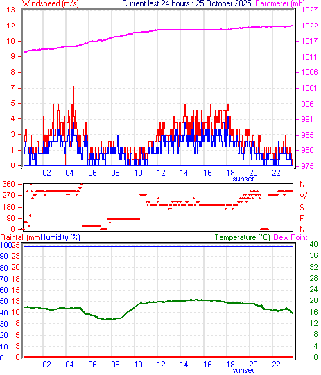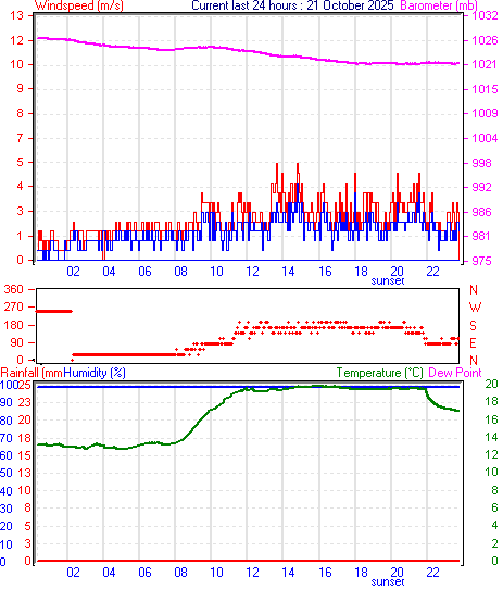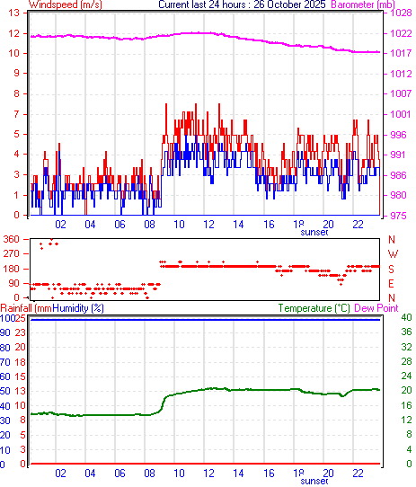 --------------------------------------------------- Average temperature 17.5 °C Average humidity 100 % Average dewpoint 17.5 °C Average barometer 1021.5 mb Average windspeed 2.3 m/s Average gustspeed 3.4 m/s Average direction 173 ° ( S ) Rainfall for month 8.0 mm Rainfall for year 359.2 mm ----------------------------------------------------------- Maximum rain per minute 0.0 mm on day 25 at time 00:02 Maximum temperature 20.8 °C on day 25 at time 12:43 Minimum temperature 13.2 °C on day 25 at time 08:11 Minimum pressure 1017.6 mb on day 25 at time 00:02 Maximum pressure 1022.8 mb on day 25 at time 12:24 Maximum windspeed 5.7 m/s from 195° on day 25 at time 13:03 Maximum gust speed 8.2 m/s from 201° on day 25 at time 11:00 Maximum humidity 100 % on day 25 at time 00:02 Minimum humidity 100 % on day 25 at time 00:02 Maximum heat index 18.0 °C on day 25 at time 09:24 Click here for todays 24 hour graph :25 :10 :2025 ------------------------------------------------------------ Averages\Extremes for day :26![]()