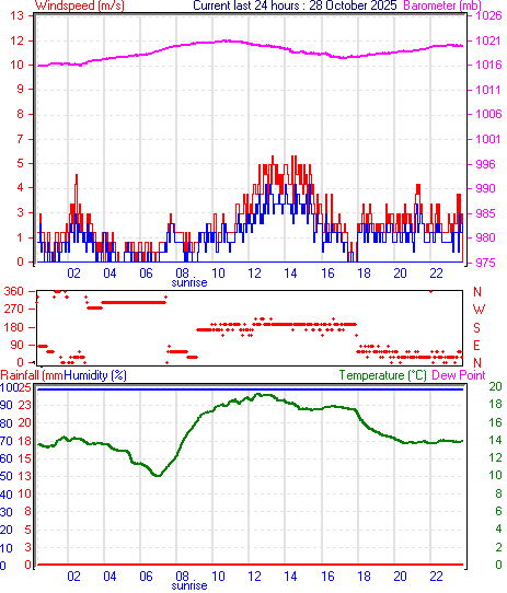 --------------------------------------------------- Average temperature 15.2 °C Average humidity 100 % Average dewpoint 15.2 °C Average barometer 1019.6 mb Average windspeed 1.4 m/s Average gustspeed 2.1 m/s Average direction 146 ° ( SE) Rainfall for month 8.0 mm Rainfall for year 359.2 mm ----------------------------------------------------------- Maximum rain per minute 0.0 mm on day 27 at time 00:02 Maximum temperature 19.3 °C on day 27 at time 12:37 Minimum temperature 10.0 °C on day 27 at time 07:09 Minimum pressure 1015.9 mb on day 26 at time 00:44 Maximum pressure 1021.4 mb on day 27 at time 10:35 Maximum windspeed 4.6 m/s from 198° on day 27 at time 14:48 Maximum gust speed 6.2 m/s from 210° on day 27 at time 13:32 Maximum humidity 100 % on day 27 at time 00:02 Minimum humidity 100 % on day 27 at time 00:02 Maximum heat index 18.0 °C on day 27 at time 16:43 Click here for todays 24 hour graph :27 :10 :2025 ------------------------------------------------------------ Averages\Extremes for day :28![]()