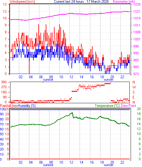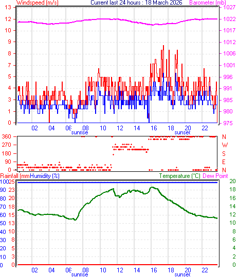 --------------------------------------------------- Average temperature 14.3 °C Average humidity 100 % Average dewpoint 14.3 °C Average barometer 1021.9 mb Average windspeed 2.3 m/s Average gustspeed 3.6 m/s Average direction 358 ° ( NW) Rainfall for month 37.6 mm Rainfall for year 309.2 mm ----------------------------------------------------------- Maximum rain per minute 0.0 mm on day 17 at time 00:02 Maximum temperature 18.7 °C on day 17 at time 16:18 Minimum temperature 10.7 °C on day 17 at time 07:12 Minimum pressure 1019.6 mb on day 17 at time 17:12 Maximum pressure 1022.5 mb on day 17 at time 22:50 Maximum windspeed 5.7 m/s from 05° on day 17 at time 21:47 Maximum gust speed 8.7 m/s from 01° on day 17 at time 17:29 Maximum humidity 100 % on day 17 at time 00:02 Minimum humidity 100 % on day 17 at time 00:02 Maximum heat index 18.0 °C on day 17 at time 16:54 Click here for todays 24 hour graph :17 :3 :2026 ------------------------------------------------------------ Averages\Extremes for day :18![]()