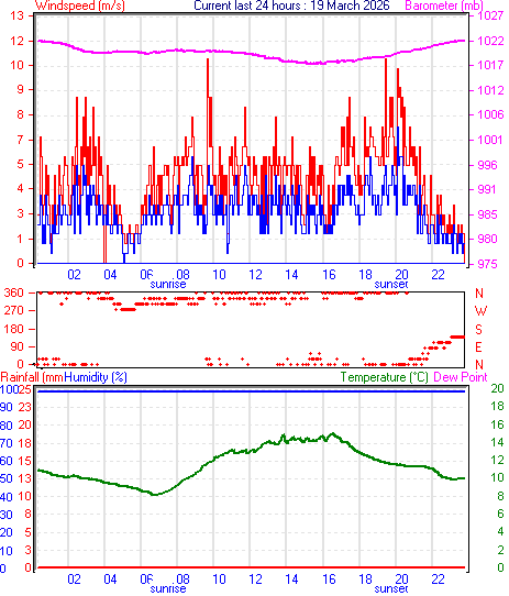 --------------------------------------------------- Average temperature 11.5 °C Average humidity 100 % Average dewpoint 11.5 °C Average barometer 1020.4 mb Average windspeed 2.7 m/s Average gustspeed 4.3 m/s Average direction 353 ° ( NW) Rainfall for month 37.6 mm Rainfall for year 309.2 mm ----------------------------------------------------------- Maximum rain per minute 0.0 mm on day 18 at time 00:02 Maximum temperature 15.1 °C on day 18 at time 16:35 Minimum temperature 8.1 °C on day 18 at time 06:57 Minimum pressure 1017.3 mb on day 18 at time 16:05 Maximum pressure 1022.3 mb on day 18 at time 00:02 Maximum windspeed 7.2 m/s from 09° on day 18 at time 20:10 Maximum gust speed 11.8 m/s from 355° on day 18 at time 20:12 Maximum humidity 100 % on day 18 at time 00:02 Minimum humidity 100 % on day 18 at time 00:02 Maximum heat index 15.1 °C on day 18 at time 16:35 Click here for todays 24 hour graph :18 :3 :2026 ------------------------------------------------------------ Averages\Extremes for day :19![]()