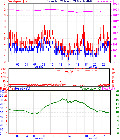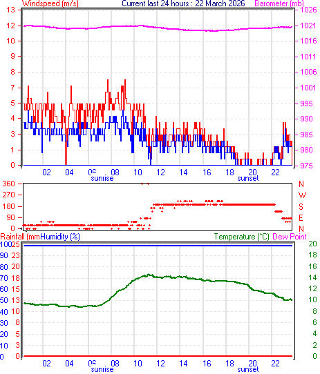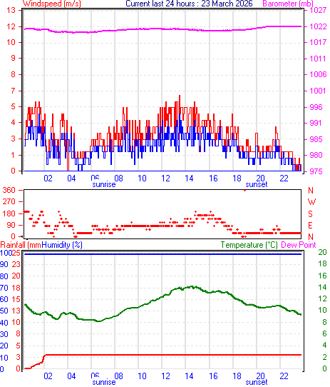 --------------------------------------------------- Average temperature 10.9 °C Average humidity 100 % Average dewpoint 10.9 °C Average barometer 1021.5 mb Average windspeed 1.9 m/s Average gustspeed 2.8 m/s Average direction 84 ° ( E ) Rainfall for month 40.6 mm Rainfall for year 312.2 mm ----------------------------------------------------------- Maximum rain per minute 0.2 mm on day 22 at time 02:06 Maximum temperature 14.3 °C on day 22 at time 14:31 Minimum temperature 8.1 °C on day 22 at time 06:39 Minimum pressure 1019.7 mb on day 22 at time 04:58 Maximum pressure 1021.9 mb on day 22 at time 22:25 Maximum windspeed 5.7 m/s from 077° on day 22 at time 12:35 Maximum gust speed 8.2 m/s from 172° on day 22 at time 02:00 Maximum humidity 100 % on day 22 at time 00:02 Minimum humidity 100 % on day 22 at time 00:02 Maximum heat index 14.3 °C on day 22 at time 14:31 Rain for the day :3.0 mm Click here for todays 24 hour graph :22 :3 :2026 ------------------------------------------------------------ Averages\Extremes for day :23![]()