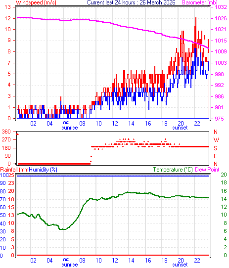 --------------------------------------------------- Average temperature 13.7 °C Average humidity 100 % Average dewpoint 13.7 °C Average barometer 1012.0 mb Average windspeed 2.5 m/s Average gustspeed 3.8 m/s Average direction 95 ° ( E ) Rainfall for month 37.6 mm Rainfall for year 309.2 mm ----------------------------------------------------------- Maximum rain per minute 0.2 mm on day 15 at time 07:17 Maximum temperature 18.2 °C on day 15 at time 14:06 Minimum temperature 10.6 °C on day 15 at time 07:42 Minimum pressure 1008.0 mb on day 15 at time 05:53 Maximum pressure 1015.7 mb on day 15 at time 21:58 Maximum windspeed 7.2 m/s from 071° on day 15 at time 12:18 Maximum gust speed 9.3 m/s from 074° on day 15 at time 11:16 Maximum humidity 100 % on day 15 at time 00:02 Minimum humidity 100 % on day 15 at time 00:02 Maximum heat index 18.0 °C on day 15 at time 14:13 Rain for the day :2.4 mm Click here for todays 24 hour graph :15 :3 :2026 ------------------------------------------------------------ Averages\Extremes for day :16![]()