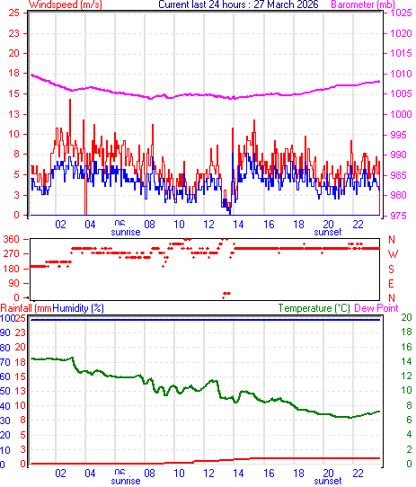 --------------------------------------------------- Average temperature 10.1 °C Average humidity 100 % Average dewpoint 10.1 °C Average barometer 1006.5 mb Average windspeed 4.2 m/s Average gustspeed 6.1 m/s Average direction 287 ° (WNW) Rainfall for month 41.6 mm Rainfall for year 313.2 mm ----------------------------------------------------------- Maximum rain per minute 0.2 mm on day 26 at time 15:05 Maximum temperature 14.6 °C on day 26 at time 03:11 Minimum temperature 6.3 °C on day 26 at time 21:56 Minimum pressure 1003.8 mb on day 26 at time 13:54 Maximum pressure 1010.6 mb on day 25 at time 00:04 Maximum windspeed 9.8 m/s from 310° on day 26 at time 15:28 Maximum gust speed 14.4 m/s from 274° on day 26 at time 03:11 Maximum humidity 100 % on day 26 at time 00:02 Minimum humidity 100 % on day 26 at time 00:02 Maximum heat index 14.6 °C on day 26 at time 03:11 Rain for the day :1.0 mm Click here for todays 24 hour graph :26 :3 :2026 ------------------------------------------------------------ Averages\Extremes for day :27![]()