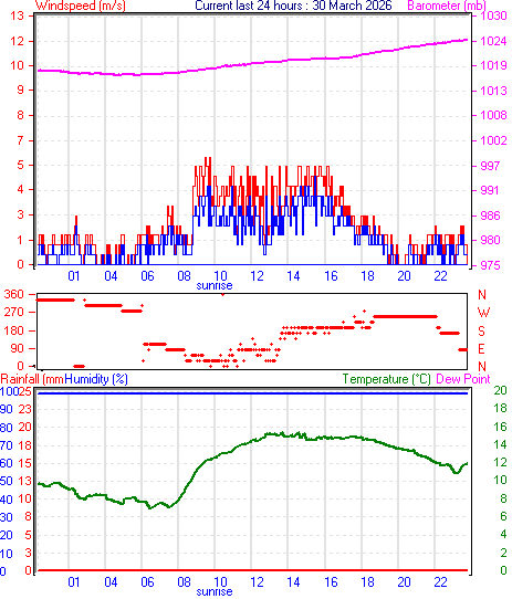 --------------------------------------------------- Average temperature 11.9 °C Average humidity 100 % Average dewpoint 11.9 °C Average barometer 1020.3 mb Average windspeed 1.4 m/s Average gustspeed 2.1 m/s Average direction 122 ° (ESE) Rainfall for month 41.6 mm Rainfall for year 313.2 mm ----------------------------------------------------------- Maximum rain per minute 0.0 mm on day 29 at time 00:02 Maximum temperature 15.4 °C on day 29 at time 14:36 Minimum temperature 6.9 °C on day 29 at time 06:33 Minimum pressure 1016.6 mb on day 29 at time 04:52 Maximum pressure 1024.5 mb on day 29 at time 00:01 Maximum windspeed 4.6 m/s from 169° on day 29 at time 15:31 Maximum gust speed 6.7 m/s from 014° on day 29 at time 13:06 Maximum humidity 100 % on day 29 at time 00:02 Minimum humidity 100 % on day 29 at time 00:02 Maximum heat index 15.4 °C on day 29 at time 14:36 Click here for todays 24 hour graph :29 :3 :2026 ------------------------------------------------------------ Averages\Extremes for day :30![]()