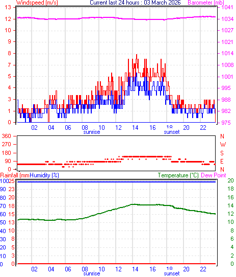 --------------------------------------------------- Average temperature 13.2 °C Average humidity 100 % Average dewpoint 13.2 °C Average barometer 1035.9 mb Average windspeed 1.1 m/s Average gustspeed 1.7 m/s Average direction 254 ° (WSW) Rainfall for month 0.0 mm Rainfall for year 271.6 mm ----------------------------------------------------------- Maximum rain per minute 0.0 mm on day 03 at time 00:02 Maximum temperature 15.4 °C on day 03 at time 15:28 Minimum temperature 11.6 °C on day 03 at time 01:17 Minimum pressure 1034.2 mb on day 03 at time 17:08 Maximum pressure 1036.3 mb on day 03 at time 11:18 Maximum windspeed 3.6 m/s from 194° on day 03 at time 12:03 Maximum gust speed 4.6 m/s from 057° on day 03 at time 22:10 Maximum humidity 100 % on day 03 at time 00:02 Minimum humidity 100 % on day 03 at time 00:02 Maximum heat index 15.4 °C on day 03 at time 15:28 Click here for todays 24 hour graph :3 :3 :2026 ------------------------------------------------------------ Averages\Extremes for day :04![]()