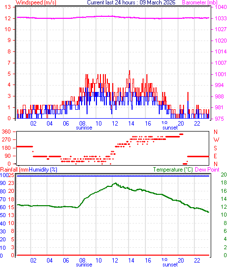 --------------------------------------------------- Average temperature 14.0 °C Average humidity 100 % Average dewpoint 14.0 °C Average barometer 1034.6 mb Average windspeed 1.3 m/s Average gustspeed 2.0 m/s Average direction 1 ° ( N ) Rainfall for month 0.0 mm Rainfall for year 271.6 mm ----------------------------------------------------------- Maximum rain per minute 0.0 mm on day 08 at time 00:02 Maximum temperature 18.0 °C on day 08 at time 12:28 Minimum temperature 10.7 °C on day 08 at time 00:02 Minimum pressure 1033.4 mb on day 08 at time 18:29 Maximum pressure 1034.9 mb on day 08 at time 12:01 Maximum windspeed 4.1 m/s from 221° on day 08 at time 14:07 Maximum gust speed 5.7 m/s from 221° on day 08 at time 14:07 Maximum humidity 100 % on day 08 at time 00:02 Minimum humidity 100 % on day 08 at time 00:02 Maximum heat index 18.0 °C on day 08 at time 12:28 Click here for todays 24 hour graph :8 :3 :2026 ------------------------------------------------------------ Averages\Extremes for day :09![]()