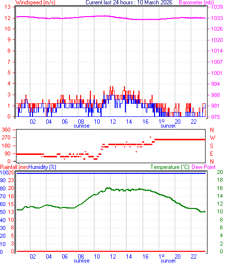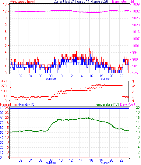 --------------------------------------------------- Average temperature 12.9 °C Average humidity 100 % Average dewpoint 12.9 °C Average barometer 1033.3 mb Average windspeed 1.4 m/s Average gustspeed 1.9 m/s Average direction 152 ° (SSE) Rainfall for month 0.0 mm Rainfall for year 271.6 mm ----------------------------------------------------------- Maximum rain per minute 0.0 mm on day 10 at time 00:02 Maximum temperature 16.0 °C on day 10 at time 15:51 Minimum temperature 10.1 °C on day 09 at time 00:28 Minimum pressure 1031.2 mb on day 10 at time 17:38 Maximum pressure 1033.8 mb on day 10 at time 22:07 Maximum windspeed 3.6 m/s from 220° on day 10 at time 16:18 Maximum gust speed 4.6 m/s from 223° on day 10 at time 15:59 Maximum humidity 100 % on day 10 at time 00:02 Minimum humidity 100 % on day 10 at time 00:02 Maximum heat index 16.0 °C on day 10 at time 15:51 Click here for todays 24 hour graph :10 :3 :2026 ------------------------------------------------------------ Averages\Extremes for day :11![]()