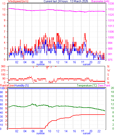 --------------------------------------------------- Average temperature 10.8 °C Average humidity 100 % Average dewpoint 10.8 °C Average barometer 1031.1 mb Average windspeed 1.8 m/s Average gustspeed 2.7 m/s Average direction 57 ° (ENE) Rainfall for month 34.8 mm Rainfall for year 306.4 mm ----------------------------------------------------------- Maximum rain per minute 1.0 mm on day 12 at time 09:21 Maximum temperature 12.2 °C on day 12 at time 06:16 Minimum temperature 8.8 °C on day 12 at time 00:02 Minimum pressure 1028.4 mb on day 12 at time 18:58 Maximum pressure 1033.0 mb on day 11 at time 00:04 Maximum windspeed 5.7 m/s from 034° on day 12 at time 18:53 Maximum gust speed 7.7 m/s from 034° on day 12 at time 18:53 Maximum humidity 100 % on day 12 at time 00:02 Minimum humidity 100 % on day 12 at time 00:02 Maximum heat index 12.2 °C on day 12 at time 06:16 Rain for the day :34.8 mm Click here for todays 24 hour graph :12 :3 :2026 ------------------------------------------------------------ Averages\Extremes for day :13![]()