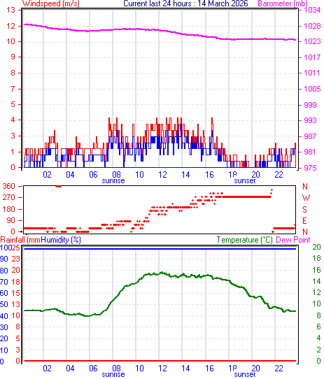 --------------------------------------------------- Average temperature 11.8 °C Average humidity 100 % Average dewpoint 11.8 °C Average barometer 1017.4 mb Average windspeed 2.9 m/s Average gustspeed 4.3 m/s Average direction 122 ° (ESE) Rainfall for month 35.2 mm Rainfall for year 306.8 mm ----------------------------------------------------------- Maximum rain per minute 0.2 mm on day 14 at time 07:19 Maximum temperature 15.1 °C on day 14 at time 13:31 Minimum temperature 8.2 °C on day 14 at time 04:29 Minimum pressure 1010.7 mb on day 14 at time 00:01 Maximum pressure 1023.3 mb on day 13 at time 00:05 Maximum windspeed 7.7 m/s from 133° on day 14 at time 19:11 Maximum gust speed 10.8 m/s from 149° on day 14 at time 17:25 Maximum humidity 100 % on day 14 at time 00:02 Minimum humidity 100 % on day 14 at time 00:02 Maximum heat index 15.1 °C on day 14 at time 13:31 Rain for the day :0.4 mm Click here for todays 24 hour graph :14 :3 :2026 ------------------------------------------------------------ Averages\Extremes for day :15![]()