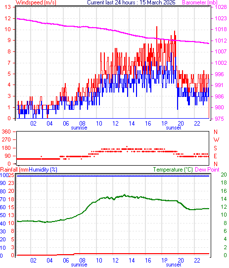 --------------------------------------------------- Average temperature 13.7 °C Average humidity 100 % Average dewpoint 13.7 °C Average barometer 1012.0 mb Average windspeed 2.5 m/s Average gustspeed 3.8 m/s Average direction 95 ° ( E ) Rainfall for month 37.6 mm Rainfall for year 309.2 mm ----------------------------------------------------------- Maximum rain per minute 0.2 mm on day 15 at time 07:17 Maximum temperature 18.2 °C on day 15 at time 14:06 Minimum temperature 10.6 °C on day 15 at time 07:42 Minimum pressure 1008.0 mb on day 15 at time 05:53 Maximum pressure 1015.7 mb on day 15 at time 21:58 Maximum windspeed 7.2 m/s from 071° on day 15 at time 12:18 Maximum gust speed 9.3 m/s from 074° on day 15 at time 11:16 Maximum humidity 100 % on day 15 at time 00:02 Minimum humidity 100 % on day 15 at time 00:02 Maximum heat index 18.0 °C on day 15 at time 14:13 Rain for the day :2.4 mm Click here for todays 24 hour graph :15 :3 :2026 ------------------------------------------------------------